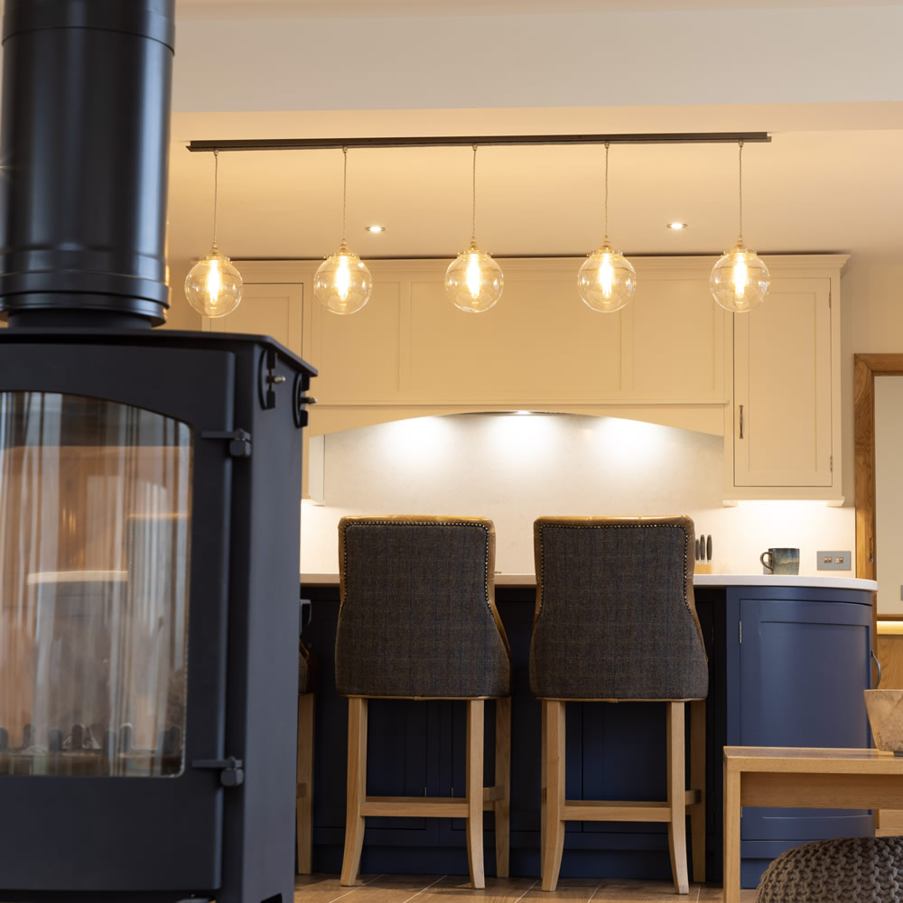 Meeting to discuss their requirements back at the showroom, we have not only supplied a new Shepherd Crook chandelier for the hallway but also taken Jeff’s own working crook and reimagined the design into the curtain pole finials throughout the house. Shown in a contemporary light burnished steel finish alongside a 3 light Broadstone pendant and a custom Broadstone over the breakfast bar, this home is finished to an incredibly high standard.