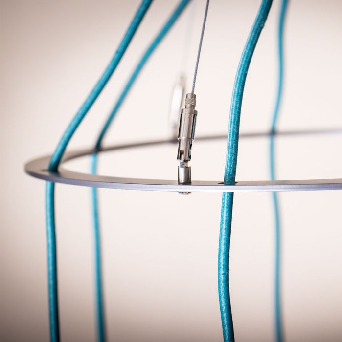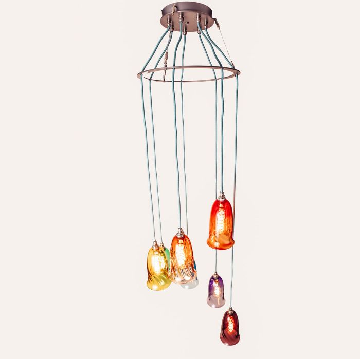 An incredible cascade of hand blown lead crystal shades with twisted optics in a rainbow of colours, suspended from a wrought iron ceiling rose and ring, designed and developed by our own in-house team of product designers and blacksmiths. This pendant light has been produced in collaboration with renowned glassmaker, Lumsdale Glass of Matlock. Ever popular, this vibrant and striking piece of handmade ironwork and handblown glass is a showcase collaboration of British craft skills and determination to pursue a dream.
