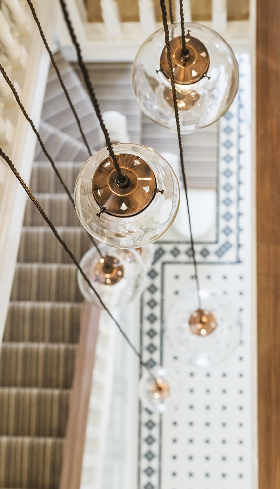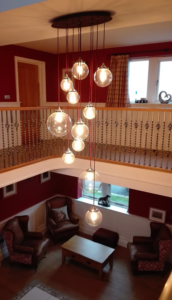 The Broadstone is a range of ceiling or pendant lighting. A series of glass globes, suspended from a forged steel ceiling rose by twisted fabric cable and held by UK made brass fititings. As standard the range offers 3, 5 and 7 light versions on our website but we are flexible enough to offer bespoke versions of this type of lighting.