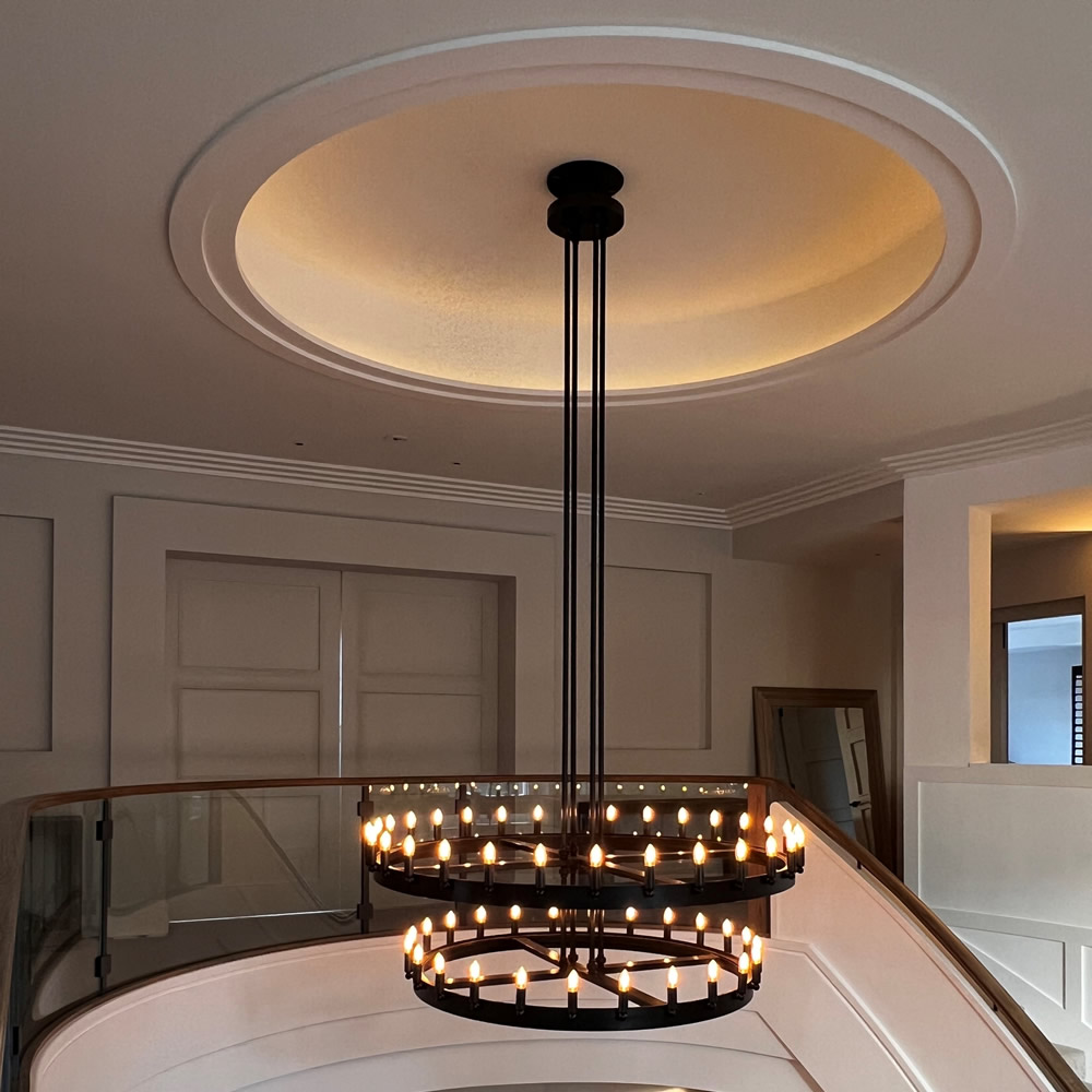 The owner has worked with us here at Nigel Tyas Ironwork to create a truly incredible one off piece alongside several other bespoke designs for her interior lighting needs. We spent time understanding the client project brief and bringing the aspirations to life for this chandelier.