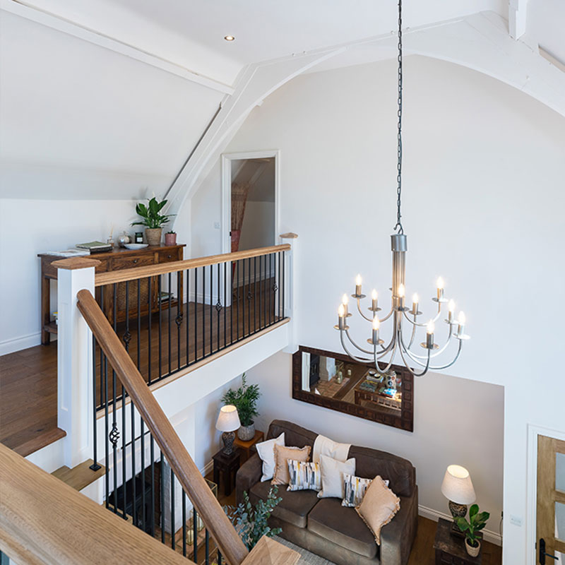 Working with the interior designer for the project, we discussed a number of options from our range of handmade designer lighting and agreed upon a medium sized, 2-tier Hartcliff chandelier in Light Burnished Steel. The design being both contemporary and classic in shape allowing it to fit well within the home décor and providing a stunning centrepiece over the stairs.