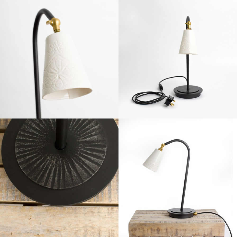 The shade is specifically designed for this product by Sarah and made exclusively for us. A rustic stoneware ceramic shade with linear inscribed pattern comes in a natural glaze or choose the delicately stamped porcelain 'lace effect' shade which glows softly when the lamp is illuminated, showing the relief effect as the light comes through the thinnest parts of the ceramic.