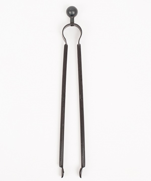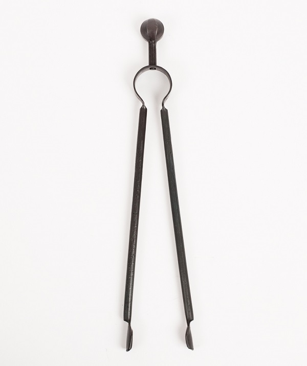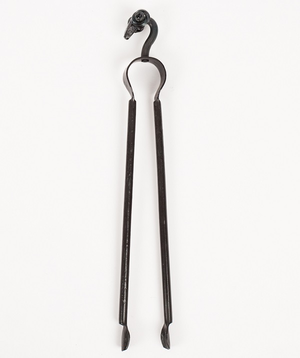 Our wrought iron fireside tongs are made from round bar and hand-forged with a riveted hinge.