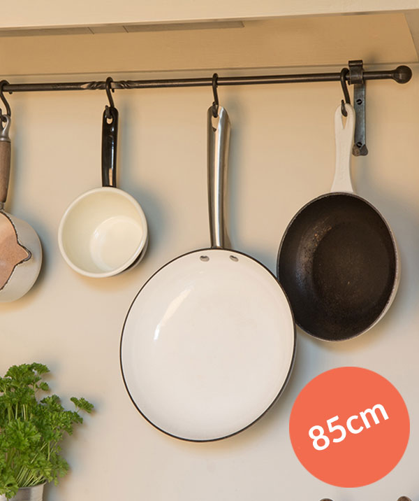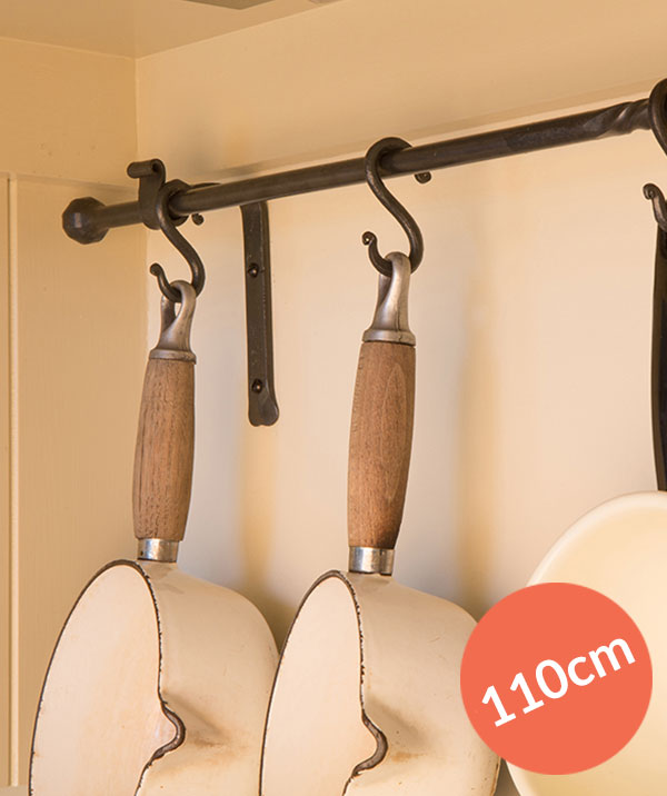Add wrought iron S-hooks to the rail, sold separately, to use it as a pan rack. Our towel rails and pan racks, plus hooks, are available with a natural black or light burnished steel surface finish.