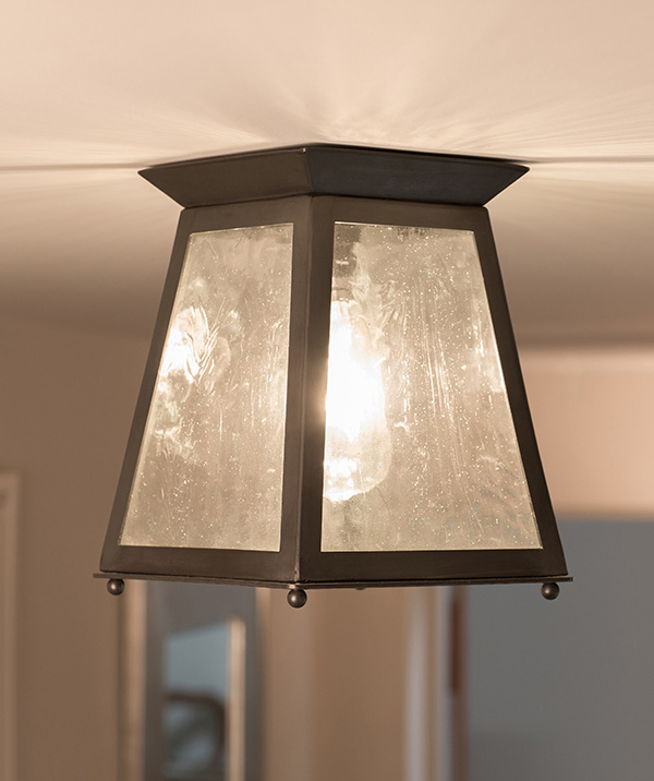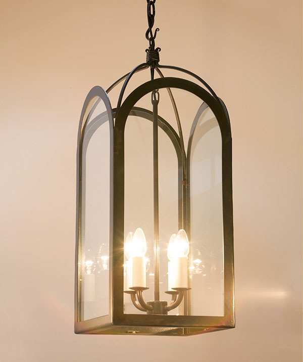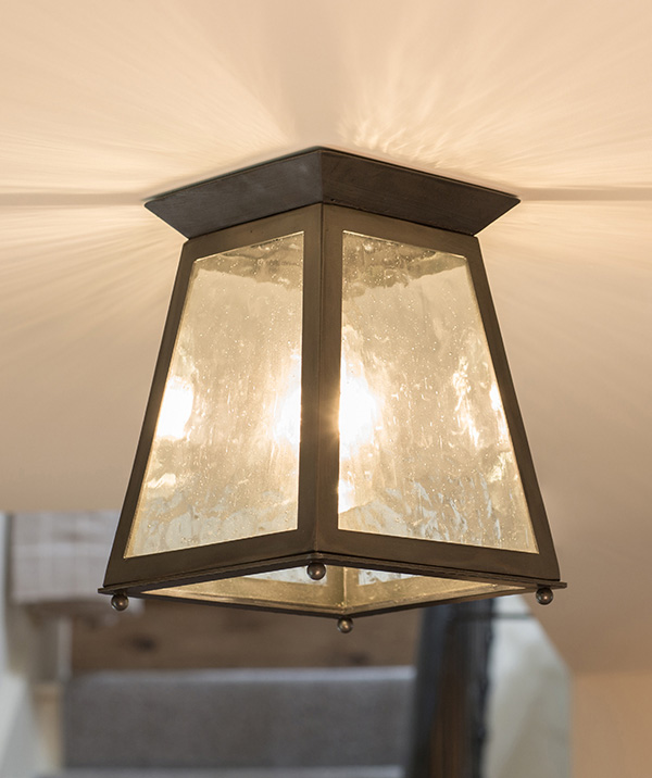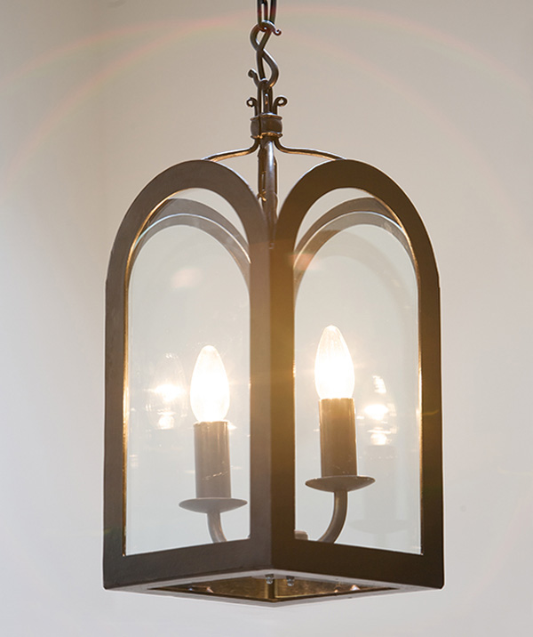 Our popular Langsett lantern is our most elegant design, evocative of lanterns throughout history and is available in single, double and four-light options. Our Carlecotes lantern is influenced by the Arts and Crafts movement and fits flush to the ceiling making it especially suitable where headspace is limited. Tiny forged spheres add detail to the corners and each Carlecotes lantern comes fitted with handmade antiqued glass.